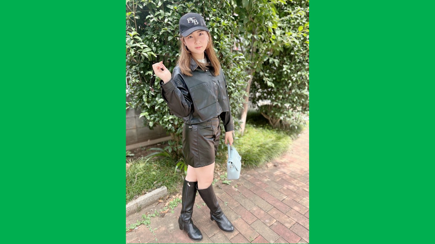 服もブーツもレザーで大人っぽさをだして、帽子・ピアス・サングラスと小物まで合わせたところがポイントです。
