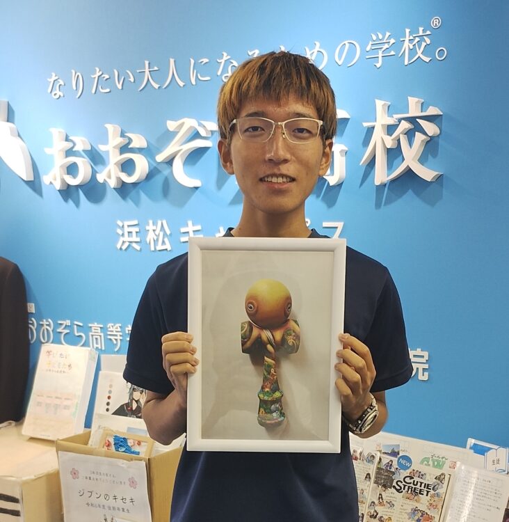 そして、このブームはプレイするだけにとどまりません。 浜松キャンパスの中村珊樹さんは、なんと「けん玉ペインティングコンテスト」で審査員特別賞を受賞!